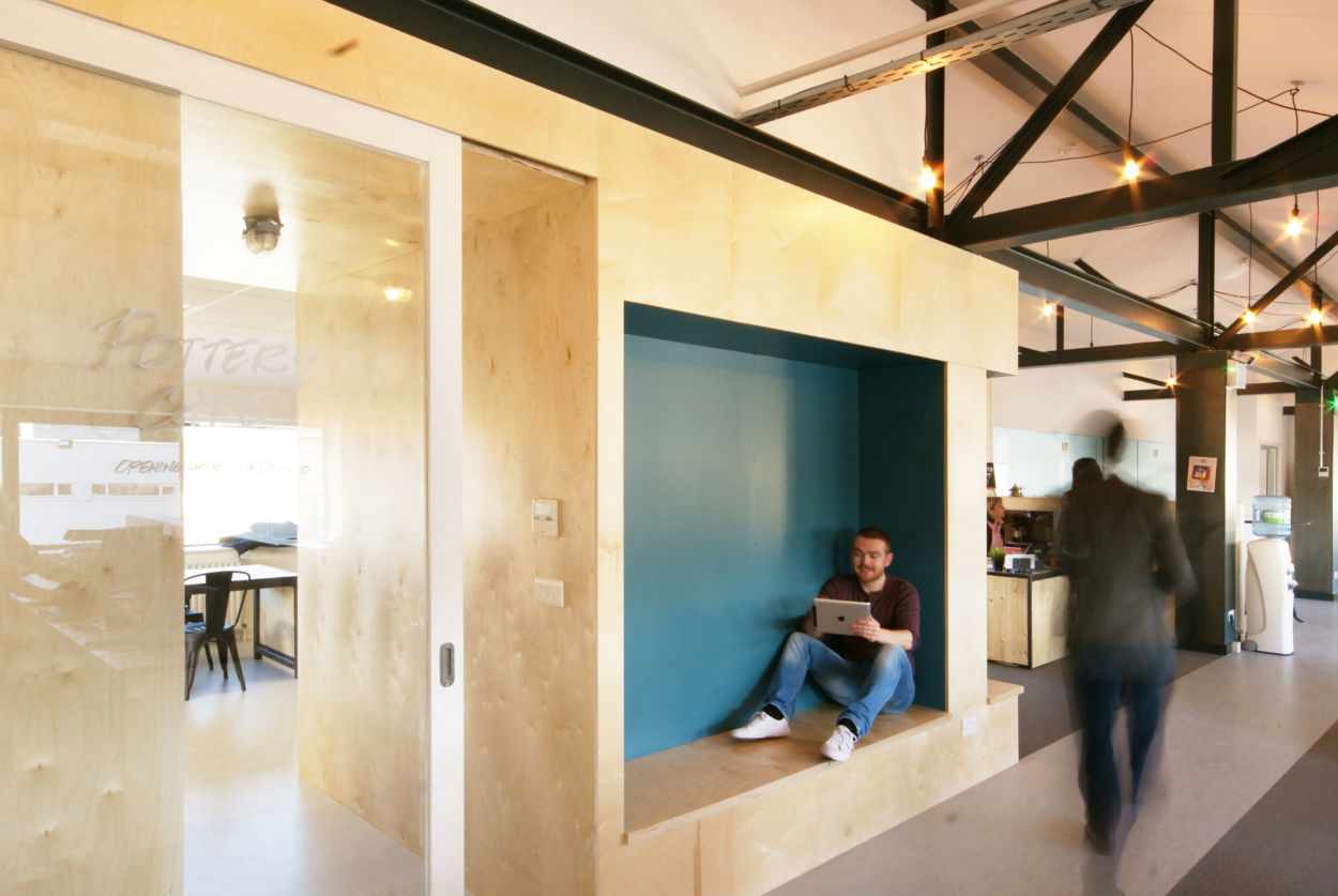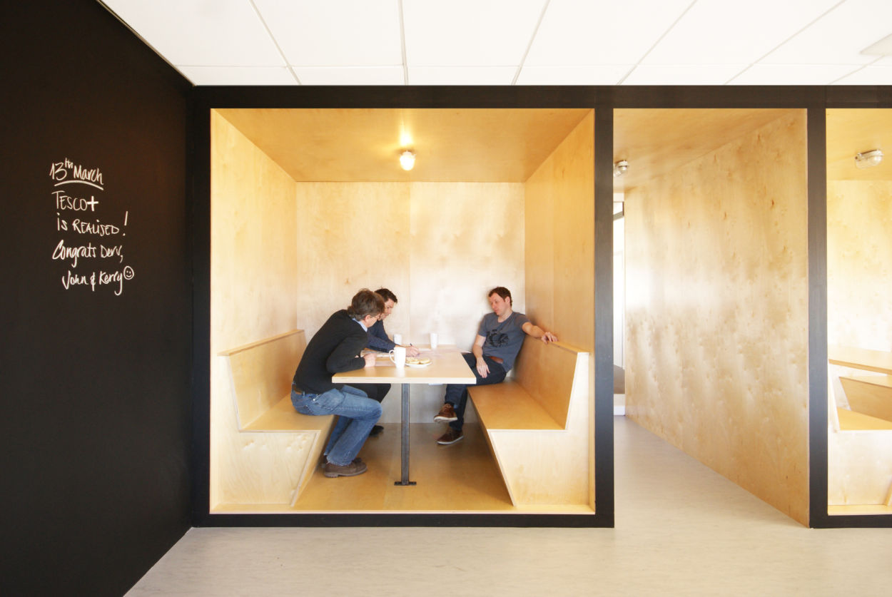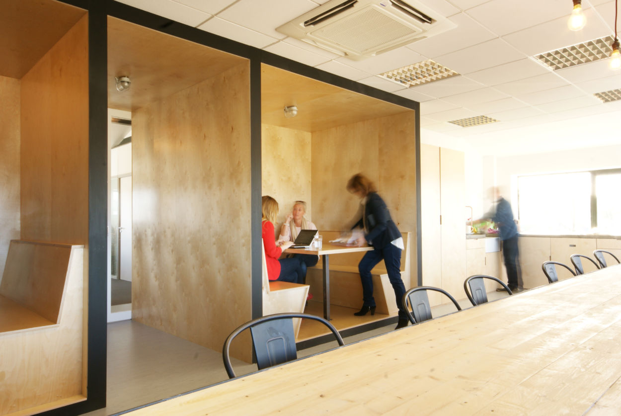 Simple materials were used to form everything from desks, chairs, training rooms, tables, kitchen units and pin up boards. The result is a smart yet free space, full of natural light with life everywhere.