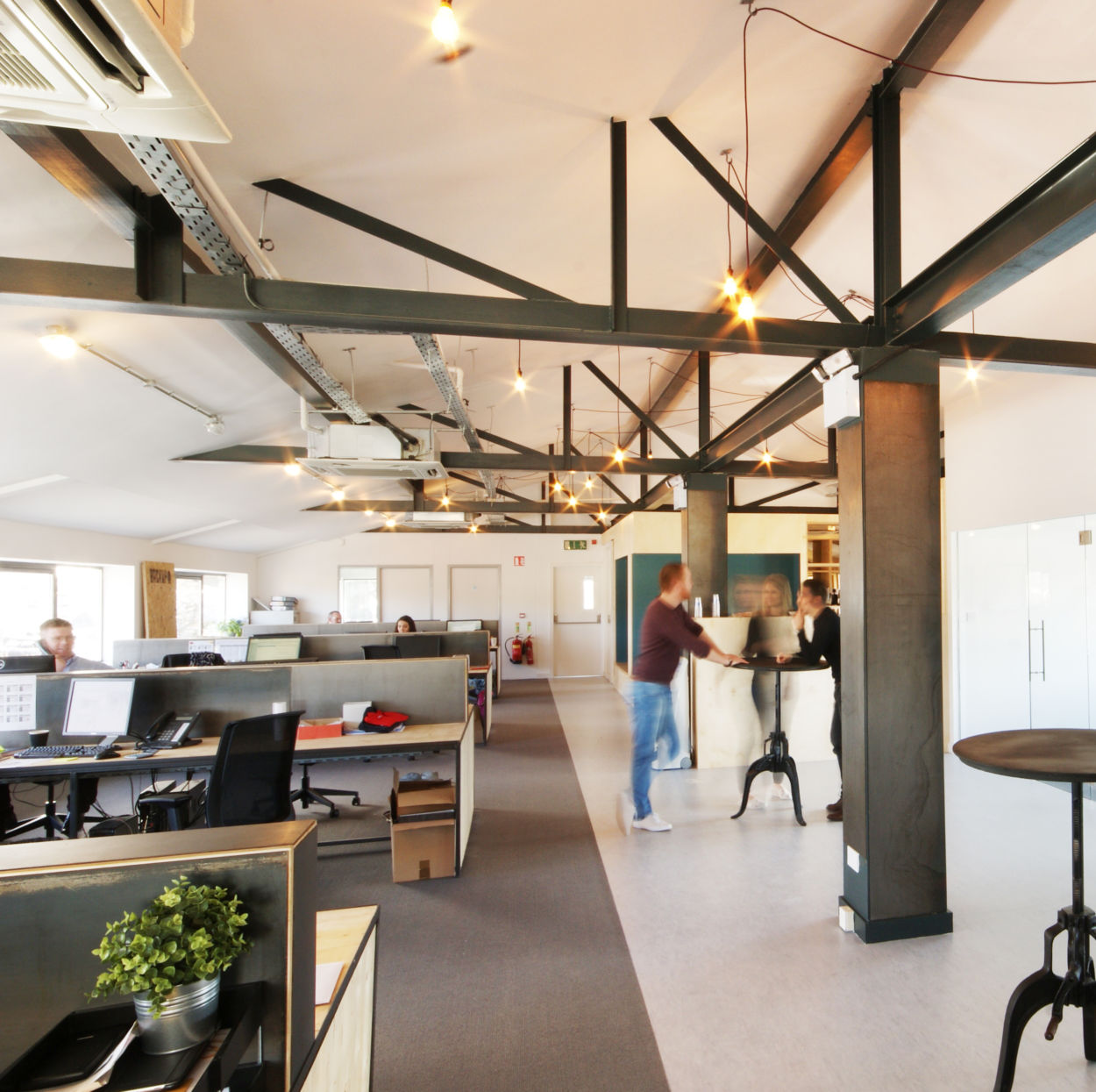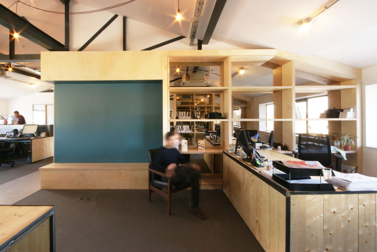 The development of this industrial unit for offices involved paring the building back to its bones, opening up and exposing the impressive steel truss roof above and bringing in as much light and space into an area that was previously dark and confused.