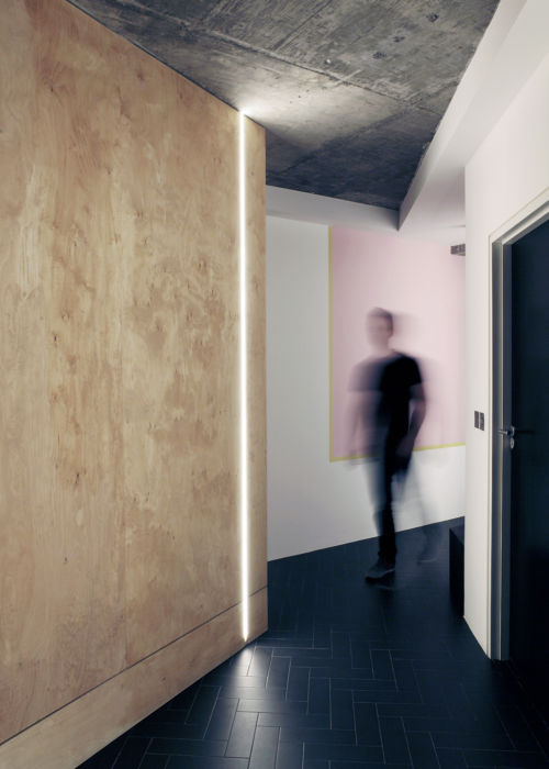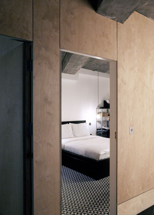 The solution was to embrace the angular layouts and enhance them, inserting plywood like pods to contain the bedrooms, with the negative space forming a series of open plan living rooms.