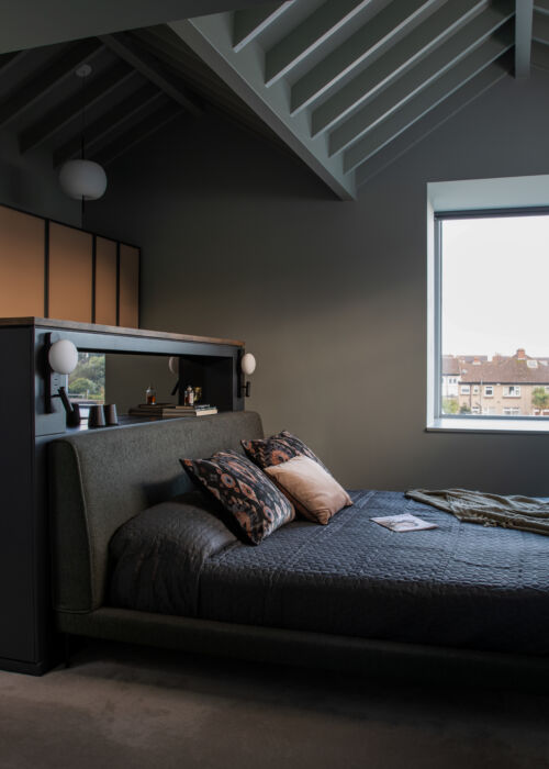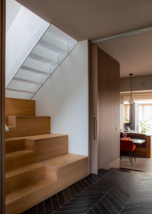 Texture everywhere – Featuring the mutinaceramics Celosia block used as a decorative screen, this kickstarted a long conversation about texture which carried on throughout the entire project. This project looked at the common challenges when opening up an existing semi-detached dwelling. Light, flow and functionality were key criteria to address, and the insertion of a central courtyard allowed us to open up the floorplan, and cluster rooms around a central lightwell. Colour and texture were the core themes that carried from the entrance hallway, up a curved stairwell and into a luxurious master suite. A transformative change to a common house typology, giving the owners a wonderfully vibrant and dynamic place to call home.