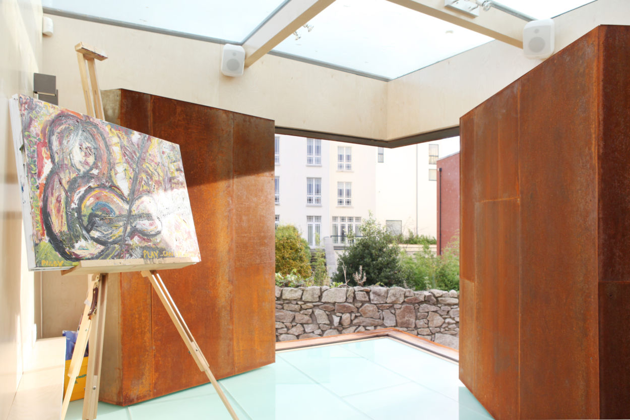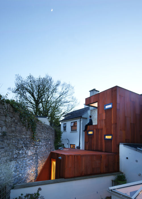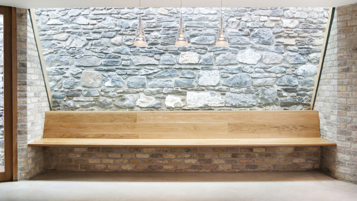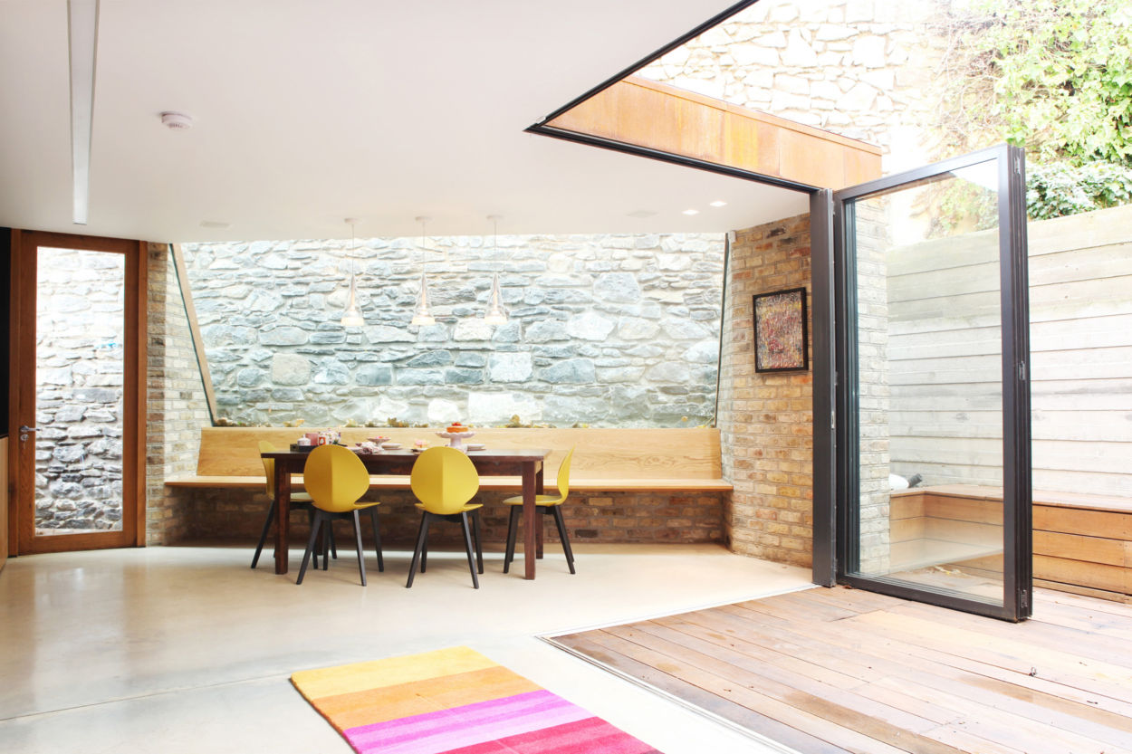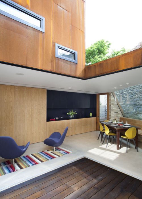 A glazed bench seat forms the dining space which helped preserve the original form and footprint of the house. Corten steel cladding envelopes the projection to the rear which will change and grow with the house in the years to come, weathering as a beautiful counterpoint to both the granite stone wall, and reflecting back to the original brick of the main house.