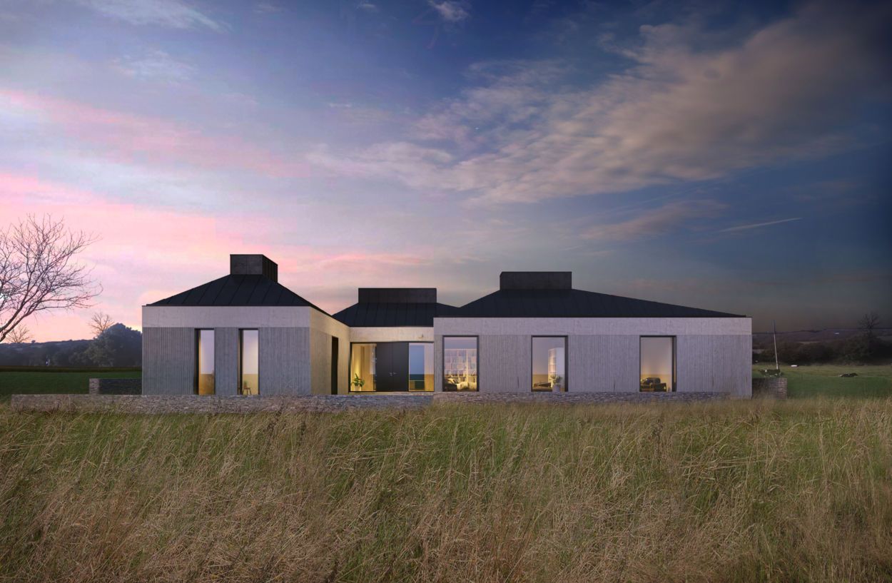 Situated amidst a rolling country landscape, the single storey dwelling is designed to integrate into its surrounding context. The dwelling is composed of a rectilinear shape with individual components pulled away from one another to delineate the division of the internal space; public (Kitchen, Dining, Living) semi-public (Lounge & Study) and private (Bedrooms). The internal ceiling line is vaulted to the roof, creating an interesting roof-scape both externally and internally, with mezzanine levels provided off the Kitchen and Master Bedroom to provide additional first floor accommodation within the single storey form.